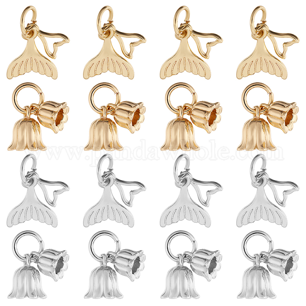 16шт 4 стили латунные подвески с покрытием стойки, долговечный, с целью перехода в кольце, подвески рыбий хвост и цветы