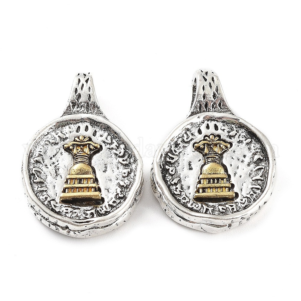 • Античный Серебрянный & Античный Золотой Латунные подвески, без кадмия, без никеля и без свинца, Буддийские заключения ювелирных изделий для счетчика клипов, плоский круг с подвесками в виде пагоды, старинное серебро и античный золотой, 24.5x17x5 мм, отверстие : 4.5 мм