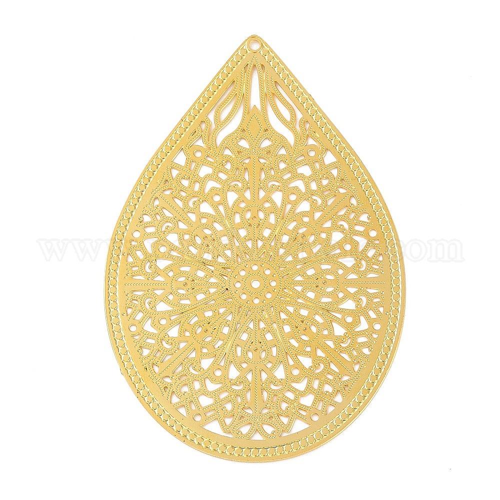 • Настоящее золото 18K Подвески из латуни с травленым металлом, слезинка с цветком, без кадмия, без никеля и без свинца, реальный 18 k позолоченный, 43x40x0.3 мм, отверстие : 1.6 мм