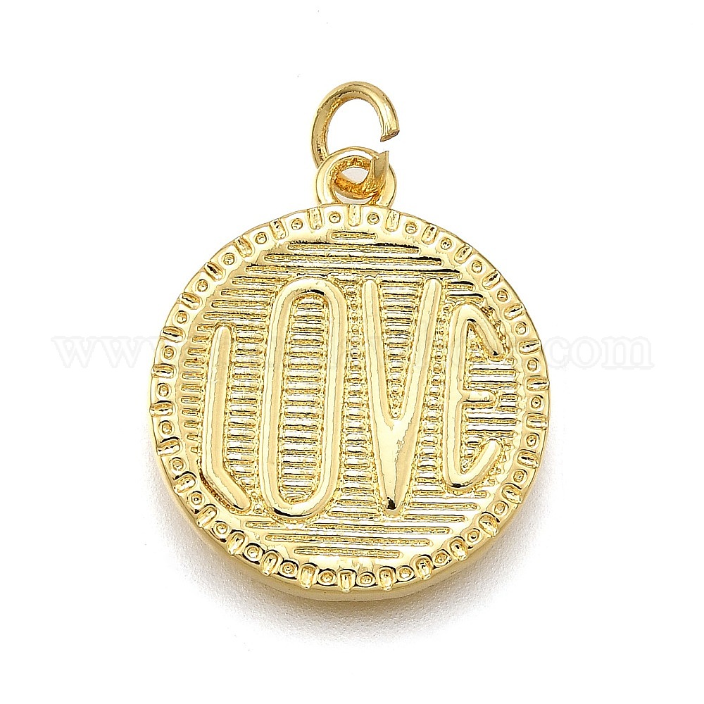 • Настоящее золото 18K Стойки обшивки латунные подвески, плоские круглые со словом "love", с целью перехода в кольце, без кадмия и без свинца, долговечный, реальный 18 k позолоченный, 20.5x18x2 мм, отверстие : 3.5 мм