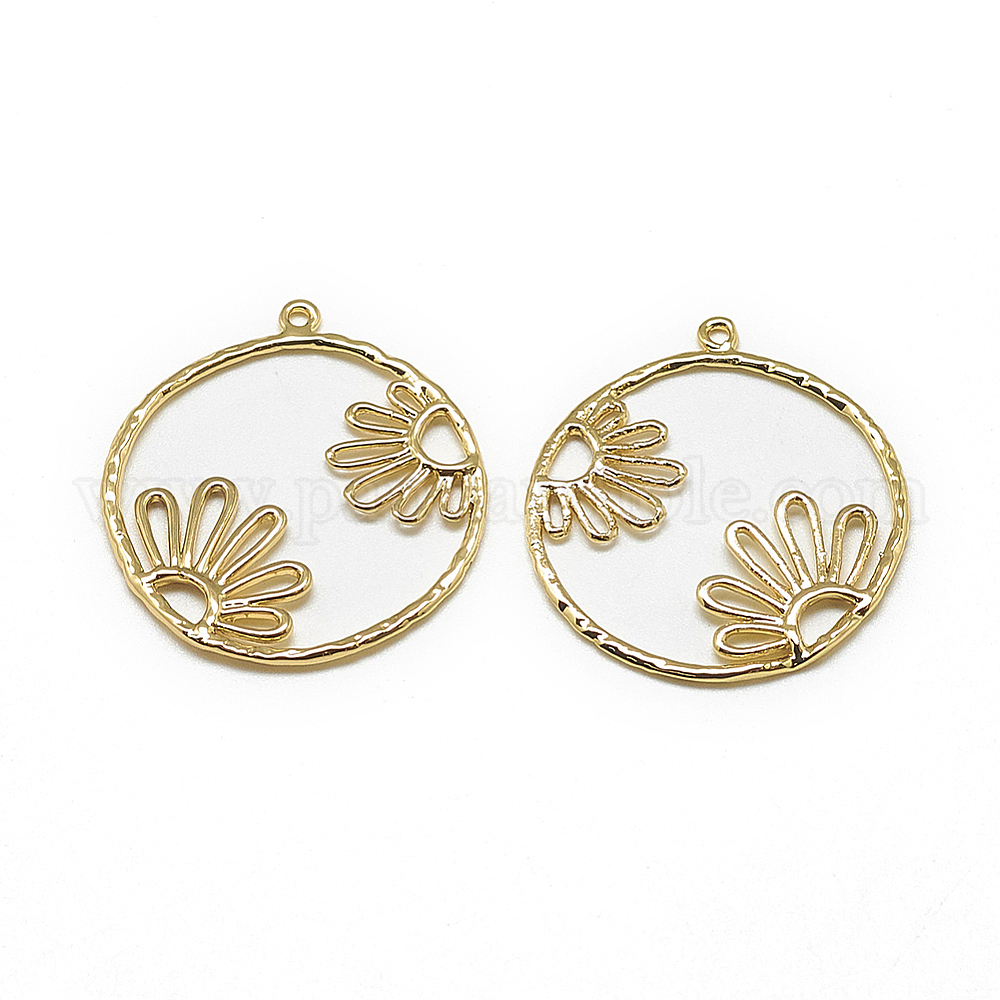 • Настоящее золото 18K Латунные подвески, плоские круглые с цветком, реальный 18 k позолоченный, 27.5x25x1 мм, отверстие : 1 мм
