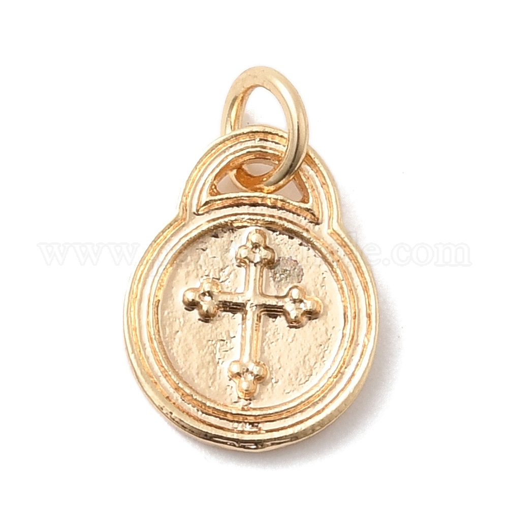 • Настоящее золото 18K Латунные подвески, плоские круглые с поперечными прелести, с целью перехода в кольце, реальный 18 k позолоченный, 13x10.5x2 мм, отверстие : 3.5 мм
