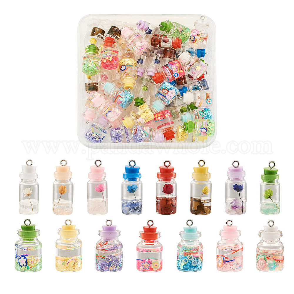 60шт 15 стиль желаний стеклянные бутылки подвески, со смолой и полимерной глиной, цветком, пробкой и платиновыми железными гвоздями
