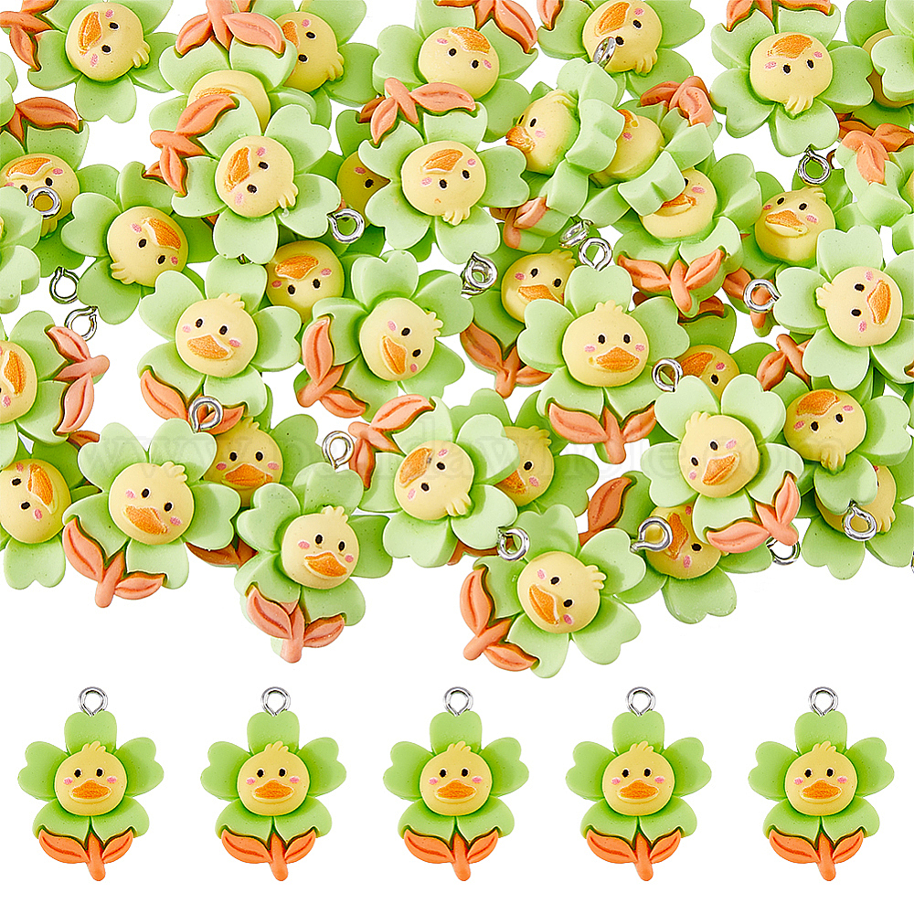 • Зелено-Желтый 60подвески из непрозрачной смолы, цветочные амулеты с уткой, с платиновыми тоновыми железными петлями, зеленый желтый, 26x18x8.5 мм, отверстие : 2 мм