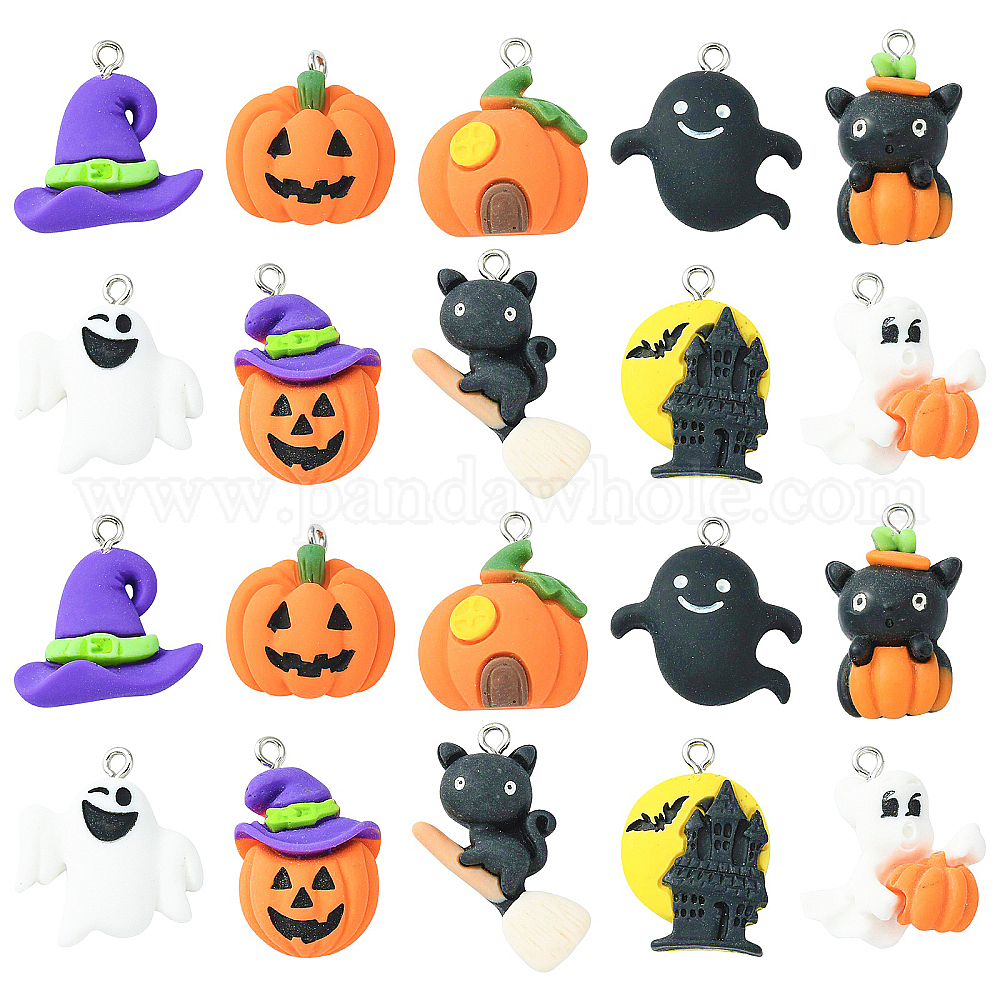 40 шт 10 стили подвески из непрозрачной смолы, хэллоуин прелести, с платиновыми тоновыми железными петлями, призрак, тыква и шляпа ведьмы, разнообразные