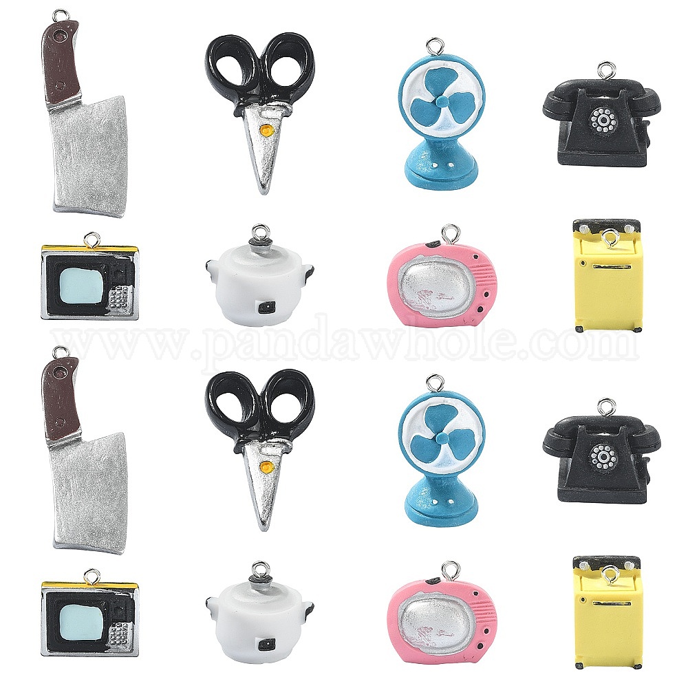 40 шт 8 стили подвески из непрозрачной смолы, инструменты прелести, с платиновыми тоновыми железными петлями, стиральная машина и вентилятор и ножницы и телефон и нож, разнообразные