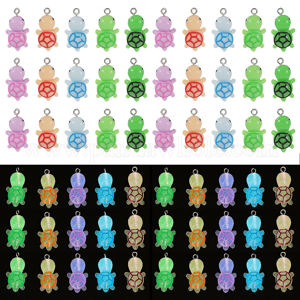60шт. 10 стили светящиеся прозрачные и непрозрачные подвески из смолы наборы, прелести морской черепахи, светится в темноте, с платиновыми тоновыми железными петлями