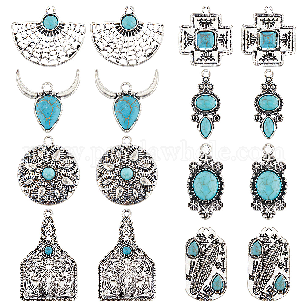 • Mixed Shapes 16шт 8 стильные подвески из искусственной бирюзы, с фурнитурой из цинкового сплава с антикварным посеребрением, разнообразные, 24.5~37x12.5~30 мм, отверстие : 1~3 мм, 2 шт / стиль