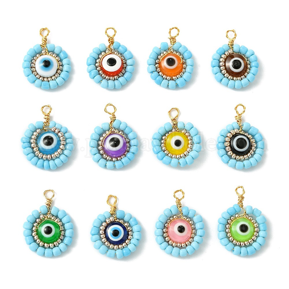 12 шт. подвески из смоляного стекла и бисера, с фурнитурой позолоченной латунной, плоские круглые с сглаза