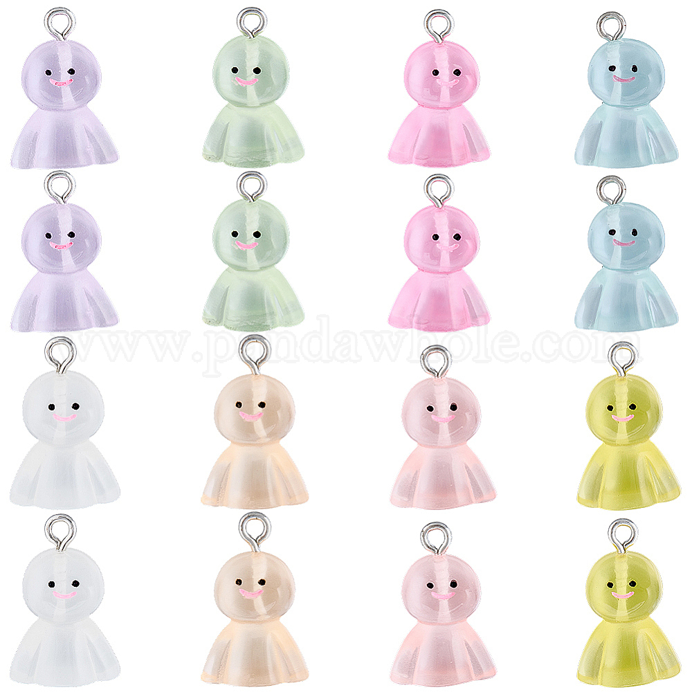 • (52) Непрозрачная лаванда 32шт 8 цветные подвески из светящейся смолы, Подвески в виде японской солнечной куклы с мультяшным рисунком и цветным покрытием из нержавеющей стали 304 петли из нержавеющей стали, разноцветные, 20~21x13.5~14x9 мм, отверстие : 2 мм, 4 шт / цвет