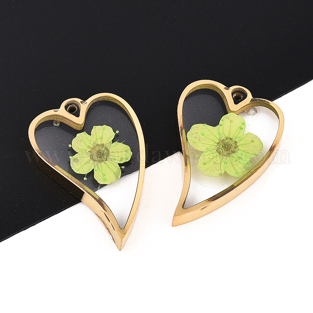 • Желто-Зеленый 304 подвески из нержавеющей стали с эпоксидной смолой, Сердце с высушенным цветком, ионное покрытие (ip), реальный 18 k позолоченный, желто-зеленый, 20x13x3 мм, отверстие : 0.9 мм