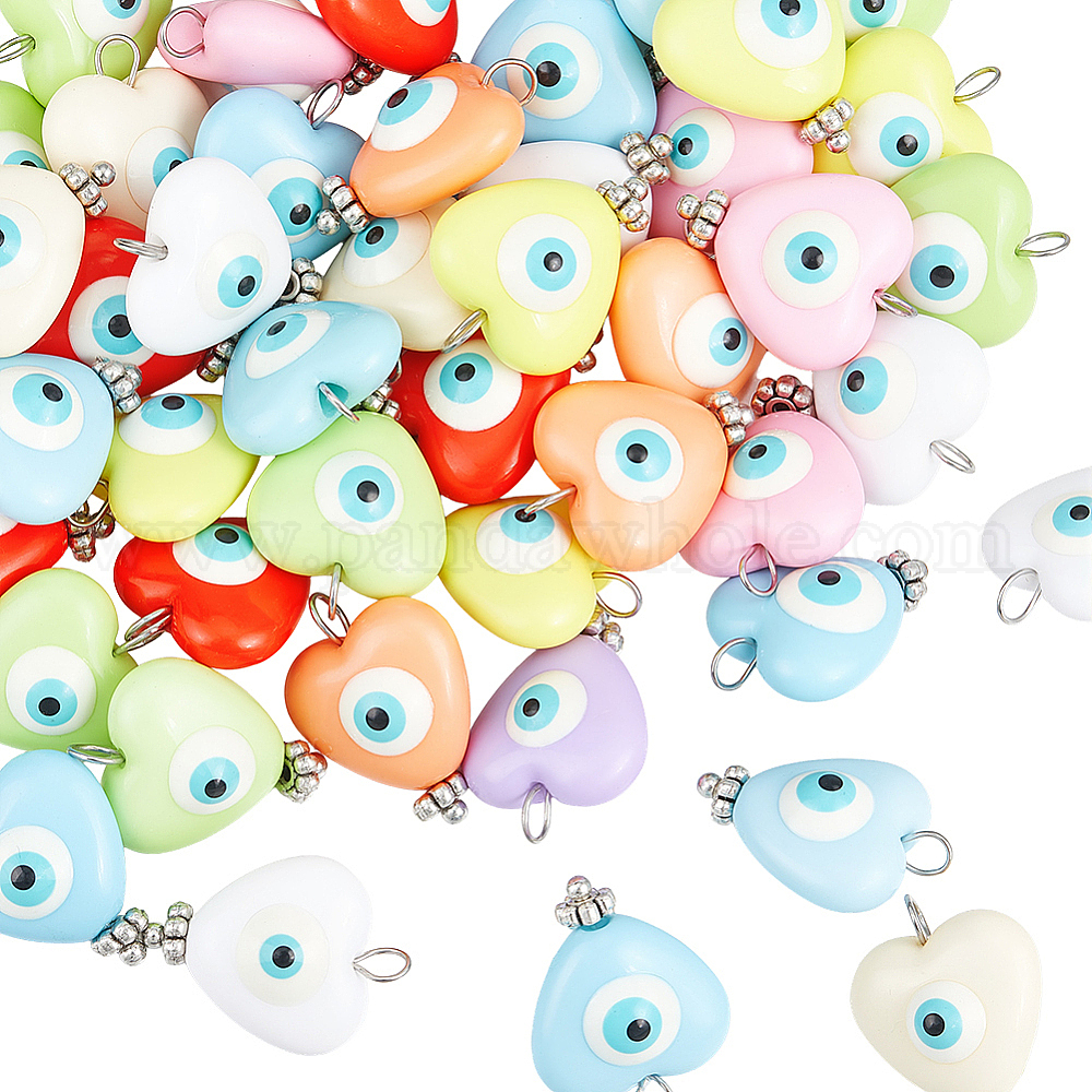 50шт. подвески из смолы от сглаза, подвески-сердечки с латунными петлями, разноцветные