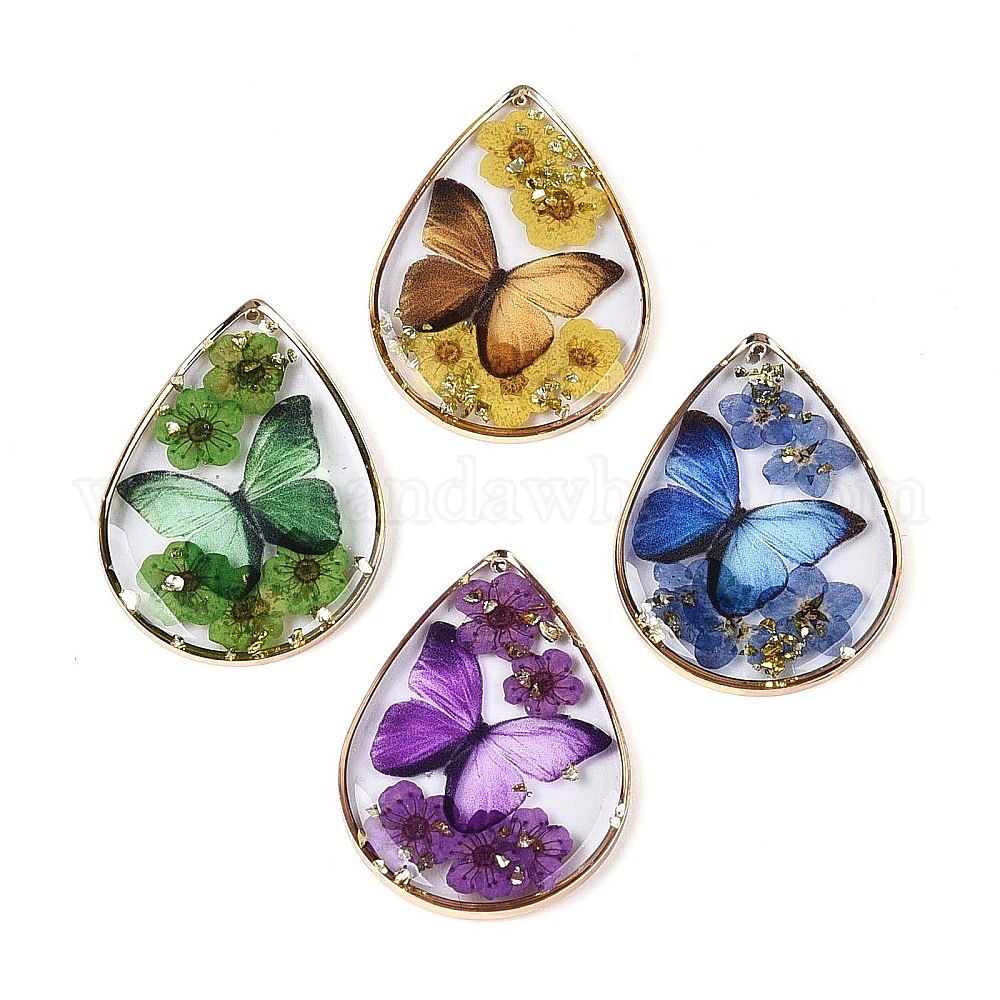 Подвески из прозрачной эпоксидной смолы, Подвеска в форме капли с засушенным цветком и бабочкой., с золотой фольгой и латунью