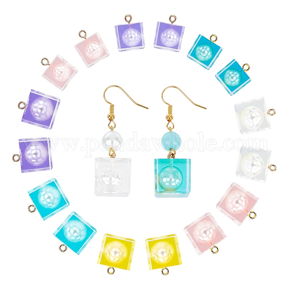 • (52) Непрозрачная лаванда Подвески из прозрачной эпоксидной смолы, с бусинами из абс-пластика с имитацией жемчуга и позолоченной железной петлей, кубические, разноцветные, 16x14x14 мм, отверстие : 2 мм, 5 цветов, 2 шт / цвет, 10 шт