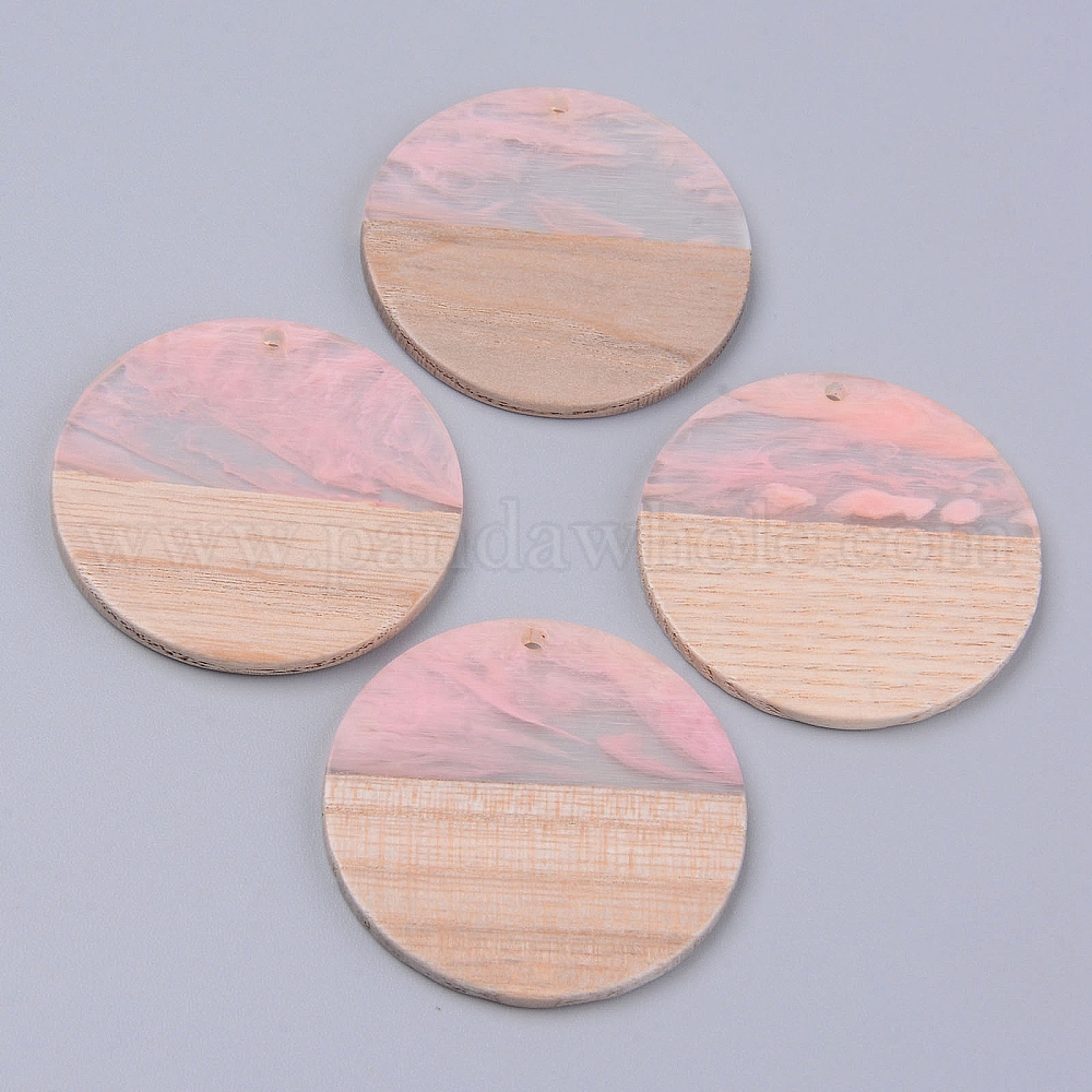 • Pink Подвески из смолы и дерева, два тона, плоско-круглые, розовые, 38x2~3 мм, отверстие : 2 мм