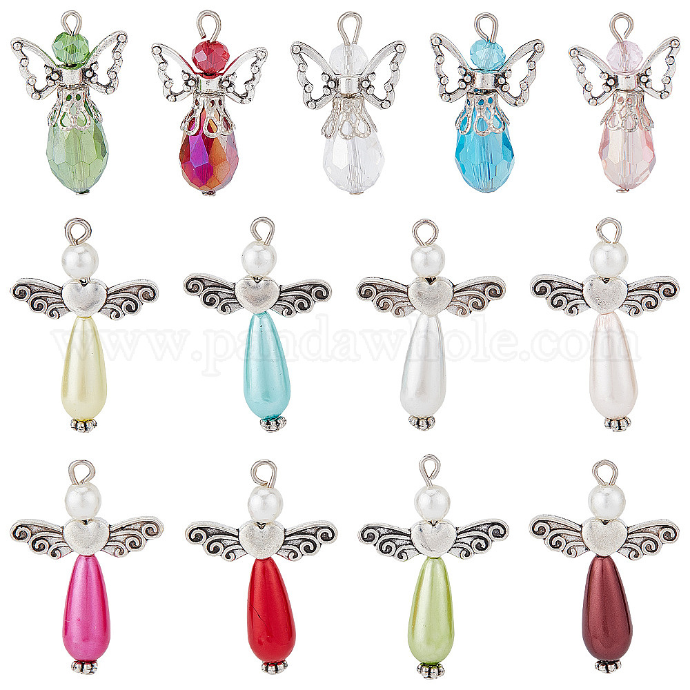30 шт 2 подвески из сплава, с гальваническим стеклом и акриловыми бусинами, имитирующими жемчуг, Сплавочные овальные бусины тибетского стиля , ангел