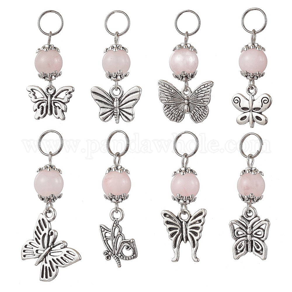 8шт. подвески из сплава в виде бабочки в тибетском стиле, с устойчивыми к потускнению 304 разъемными кольцами из нержавеющей стали и бусинами из натурального розового кварца (032GXM)