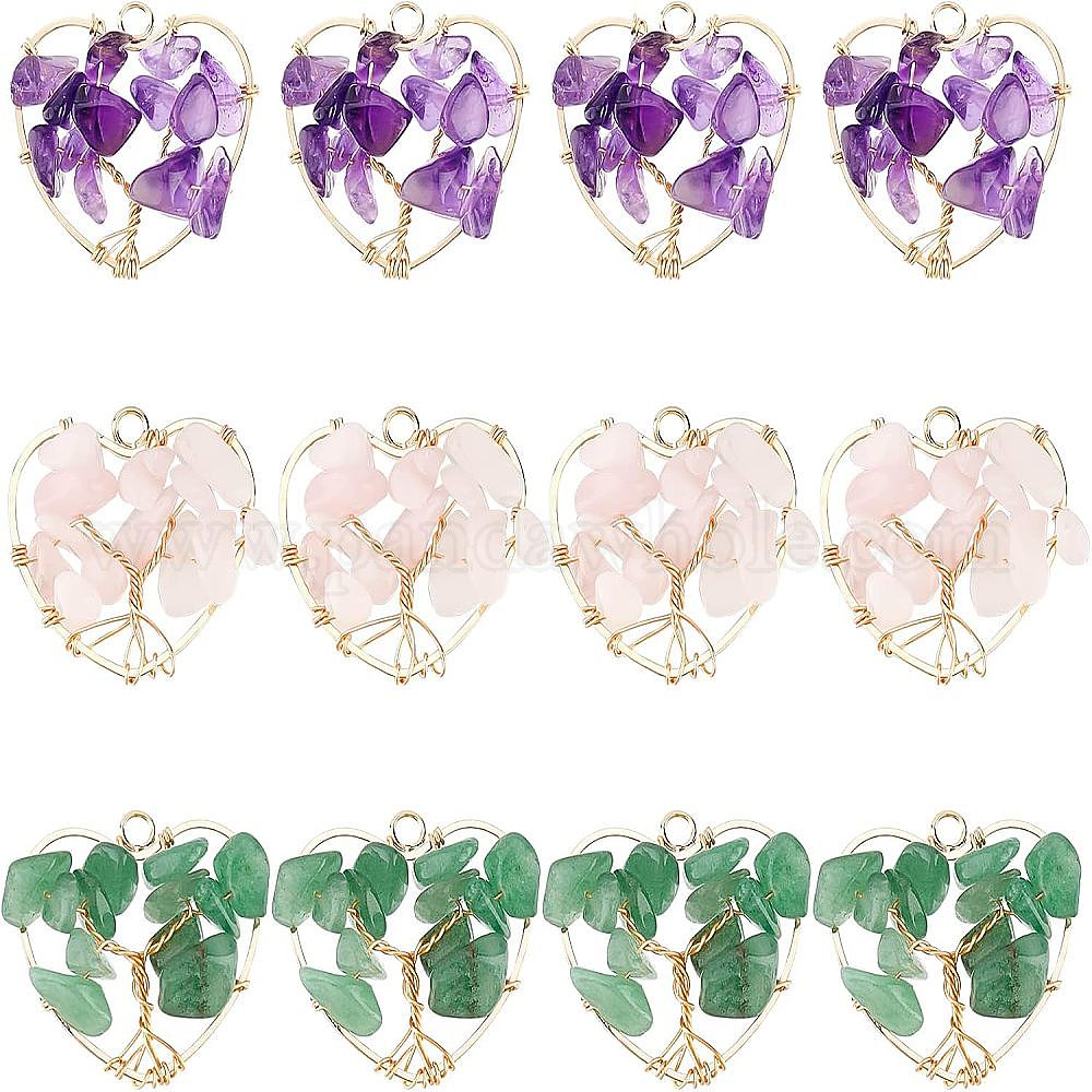 6 шт 3 стили чакра натуральный гемстоун медная проволока большие подвески, смешанные окрашенные и неокрашенные, плоский круглый и сердце с деревом жизни