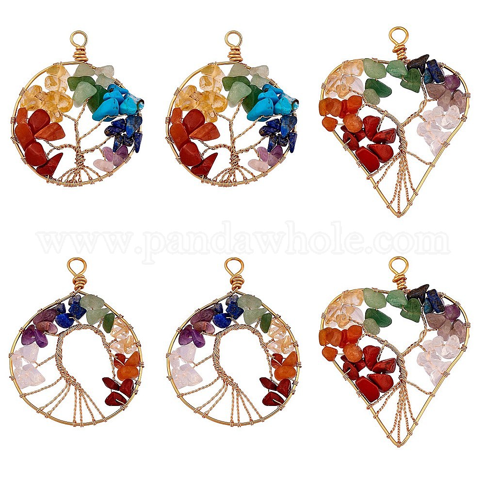 6шт 3 стили натуральный гместон медная проволока большие подвески, натуральный аметист, зеленый авантюрин, цитрин, лазурит, красная яшма, красный авантюрин и кристалл кварца, сердце и плоская круглая с деревом