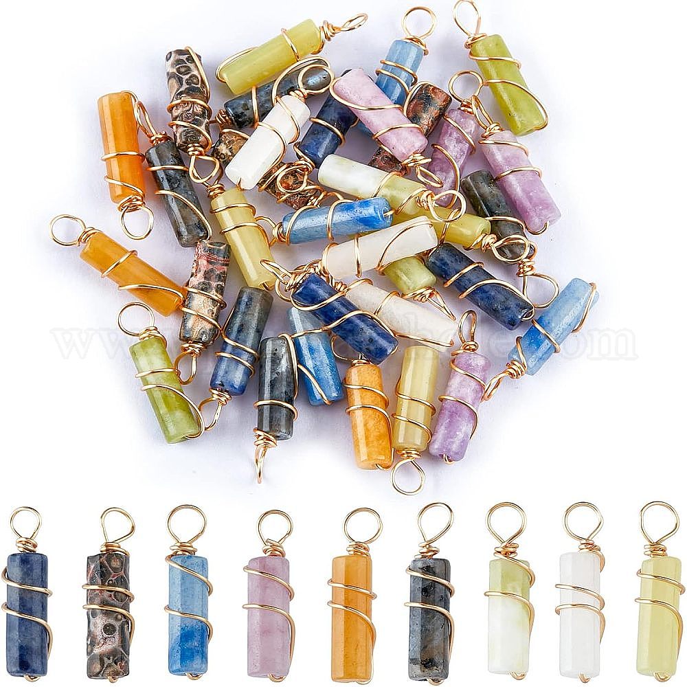36шт 9 стили подвески из натуральных смешанных камней, с обмоткой из экологически чистой медной проволоки светло-золотистого цвета, колонка