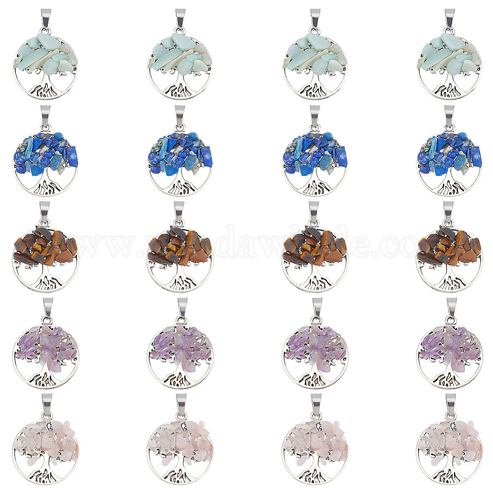20шт 5 стили подвески из натуральных смешанных камней, с выводами из сплава и 304 нержавеющей стали, плоская круглая с подвеской дерево жизни, смешанные окрашенные и неокрашенные