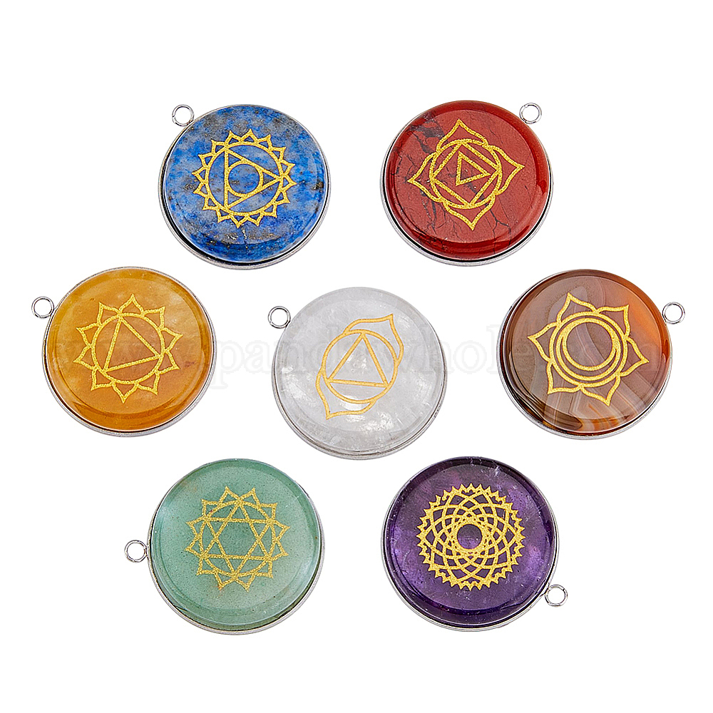 1 набор 7 стили подвески из смешанных натуральных и синтетических камней, с 304 фурнитурой из нержавеющей стали, плоская круглая подвеска с узором из чакр, смешанные окрашенные и неокрашенные