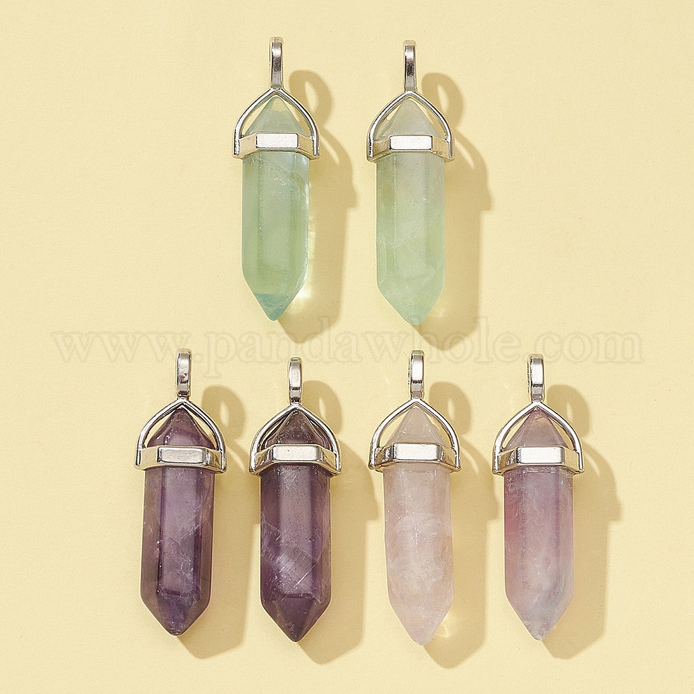• Платина 6шт 3 стили натуральные смешанные камни остроконечные подвески с двойным концом, натуральный аметист, разноцветный флюорит и зеленый флюорит, шарм в виде граненой пули, с подвеской из случайного сплава с шестигранной головкой, платина, 37~40x12 мм, отверстие : 3x4 мм, 2 шт / стиль