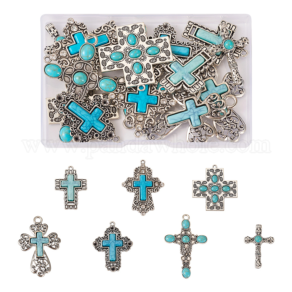 14шт 7 стили синтетическая бирюза большие подвески, со сплавочной фурнитурой античного серебряного тона, религия крест очарование
