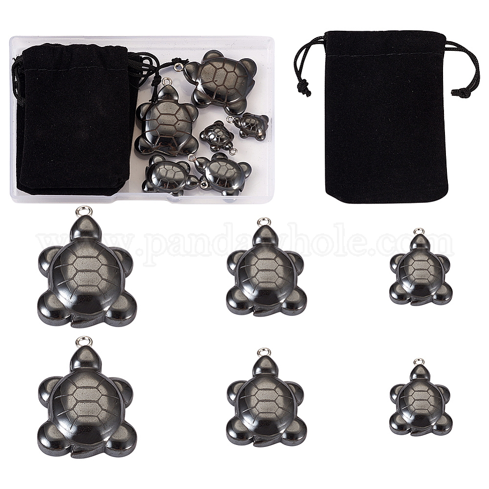 6 шт. 3 стили немагнитные подвески из гематита, черепаховые чары, с железными петлями платинового тона и мешочками на шнурках из бархатной ткани