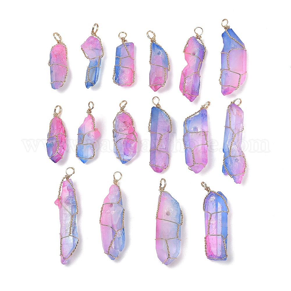 16 шт. гальванические необработанные грубые подвески из натурального кварца, Подвески-самородки в обертке из светлой позолоченной медной проволоки, граненые