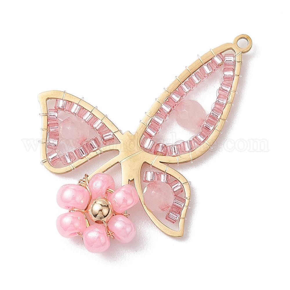 • Золотой Подвески из натурального розового кварца и стеклянных бусин, 201 бабочка из нержавеющей стали с цветочными подвесками, золотые, 34x33x6 мм, отверстие : 1.5 мм