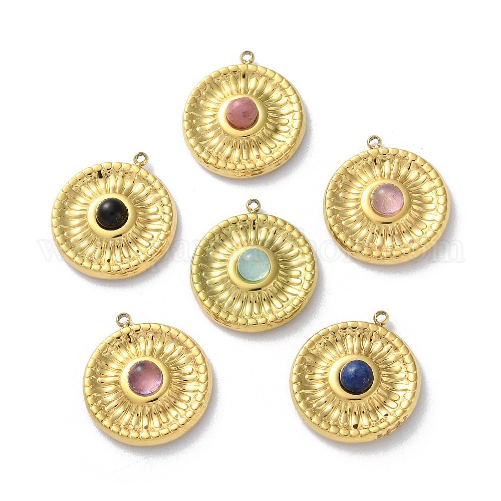 Природные смешанные подвески драгоценных камней, ионное покрытие (IP) 304 плоские круглые подвески из нержавеющей стали, смешанные окрашенные и неокрашенные
