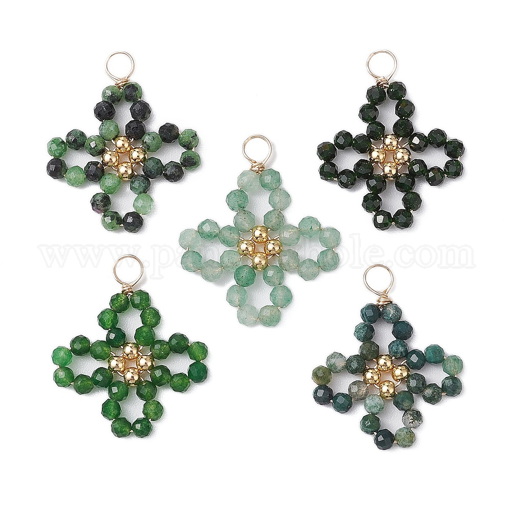 5 шт. 5 стили натуральный зеленый авантюрин и моховой агат и тайваньский нефрит и рубин в цоизите и синтетический зеленый авантюрин ограненные круглые бусины подвески, подвески клевер с латунной фурнитурой, золотой свет