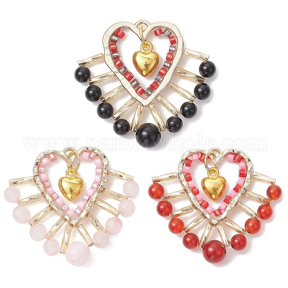 3 шт. 3 стили подвески из натурального черного оникса (окрашенного и нагретого), сердолика, розового кварца и стеклянных бусин, литые сердце прелести, золотой свет