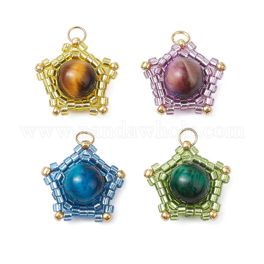 Подвески в виде звезд из натурального тигрового глаза (окрашенного и нагретого) и стеклянных бусин ручной работы, с прыжковых колец, золотые