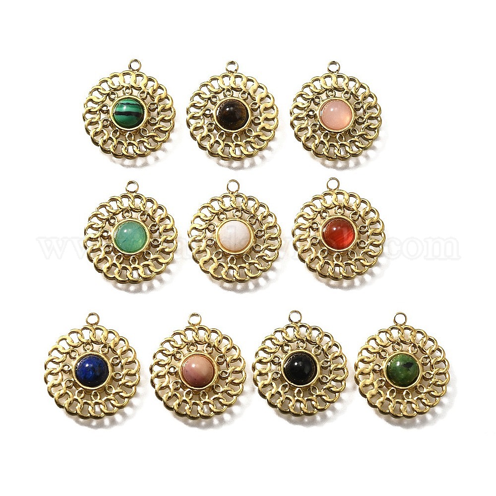 • Смешанные камни 304 подвески из нержавеющей стали, плоско-круглые, с натуральным смешанным драгоценным камнем, реальный 18 k позолоченный, ионное покрытие (ip), 18x16x3.5 мм, отверстие : 1.2 мм