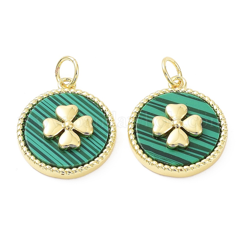 Подвески из синтетического малахита с покрытием из стойки, латунные плоские круглые подвески с клевером, без кадмия и без свинца