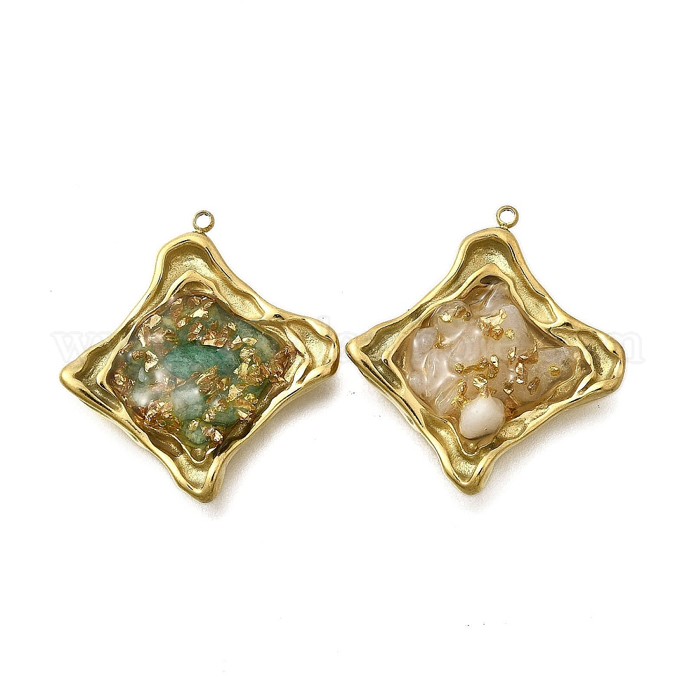 304 нержавеющей стальной эмали подвески, с натуральными драгоценными камнями внутри и золотой фольгой, ромбовидный шарм, золотые, ионное покрытие (ip)