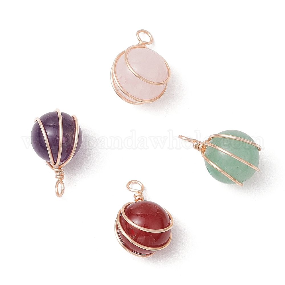 4шт. 4 стили подвески в виде шара из натурального розового кварца, зеленого авантюрина, аметиста и сердолика, обмотанные медной проволокой, круглые подвески, смешанные окрашенные и неокрашенные (031TB8)