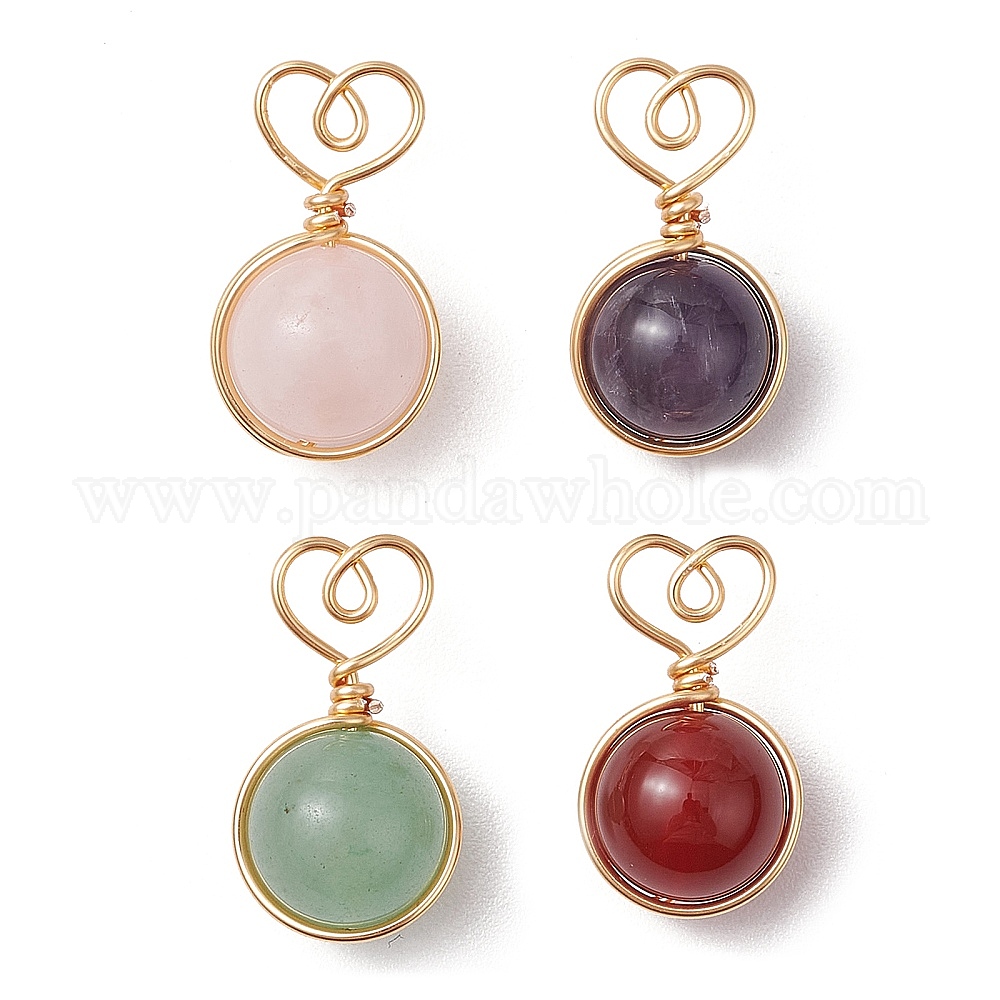 • Золотой 4 шт. 4 стили подвески в форме сердца с шаром из медной проволоки, натурального розового кварца, зеленого авантюрина, аметиста и сердолика, круглые подвески, смешанные окрашенные и неокрашенные, золотые, 20.5~21x11.5~12x10~10.5 мм, отверстие : 1.5 мм, 1 шт / стиль