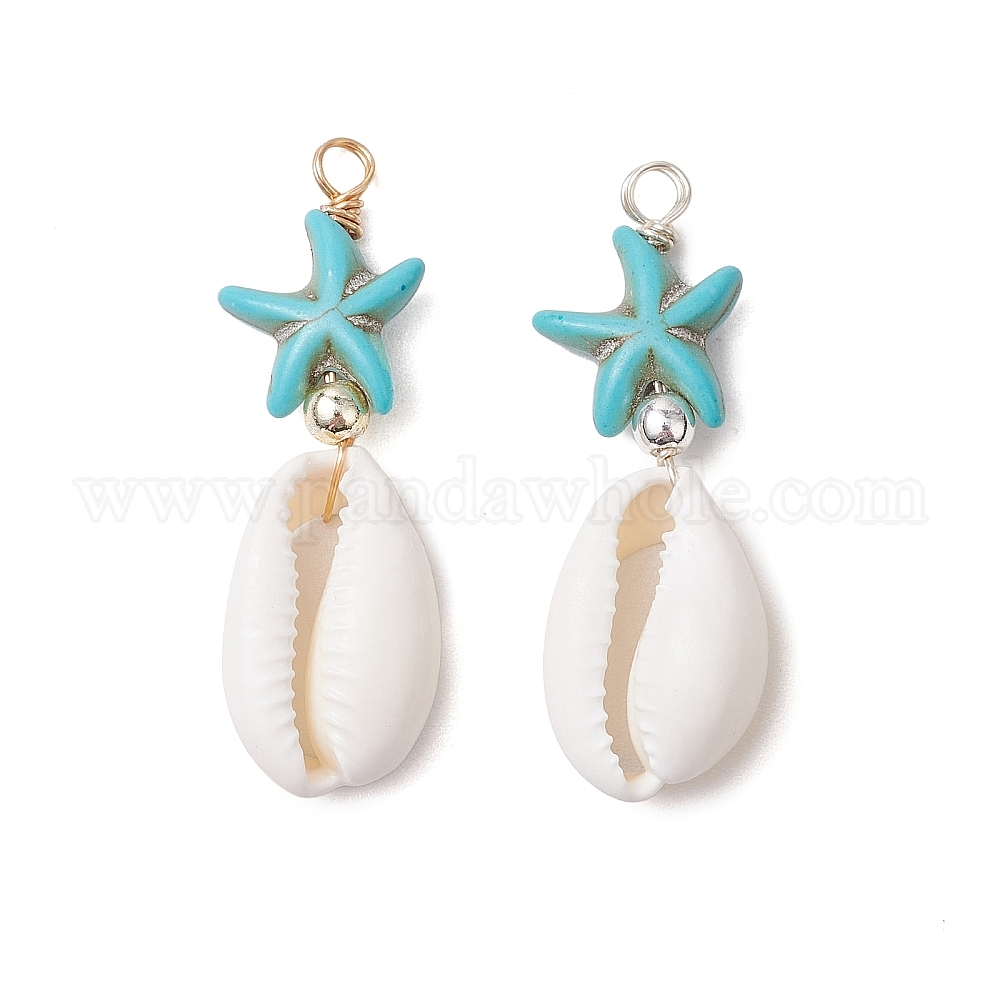 Подвески из ракушек каури и синтетической бирюзы в виде морских звезд, подвески в форме ракушки с латунными бусинами, бирюзового цвета
