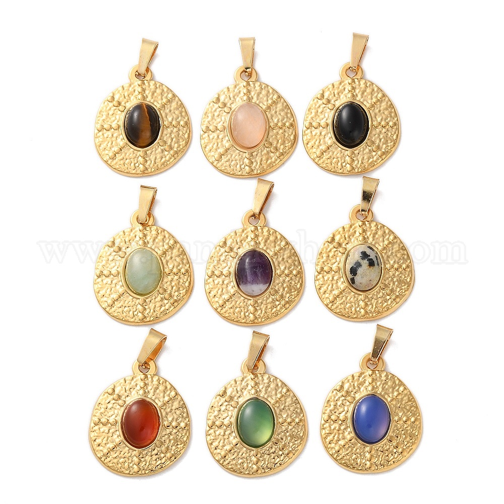 • Смешанные камни Природные смешанные подвески драгоценных камней, 304 из нержавеющей стали плоские круглые прелести, ионное покрытие (ip), золотые, смешанные окрашенные и неокрашенные, 21x17.5x4~4.5 мм, отверстие : 4.5x3 мм