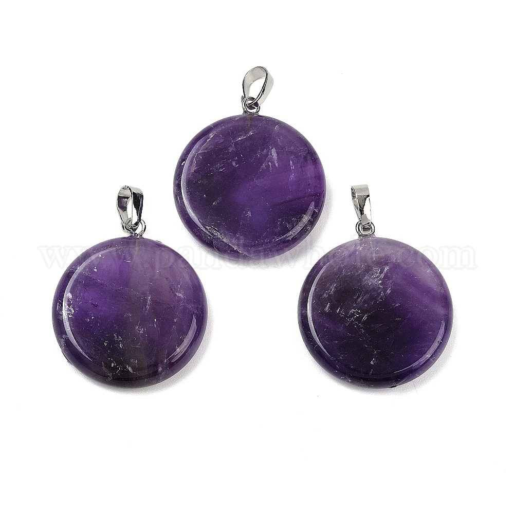 Подвески из натурального аметиста , подвески-диски с латунной фурнитурой платинового тона