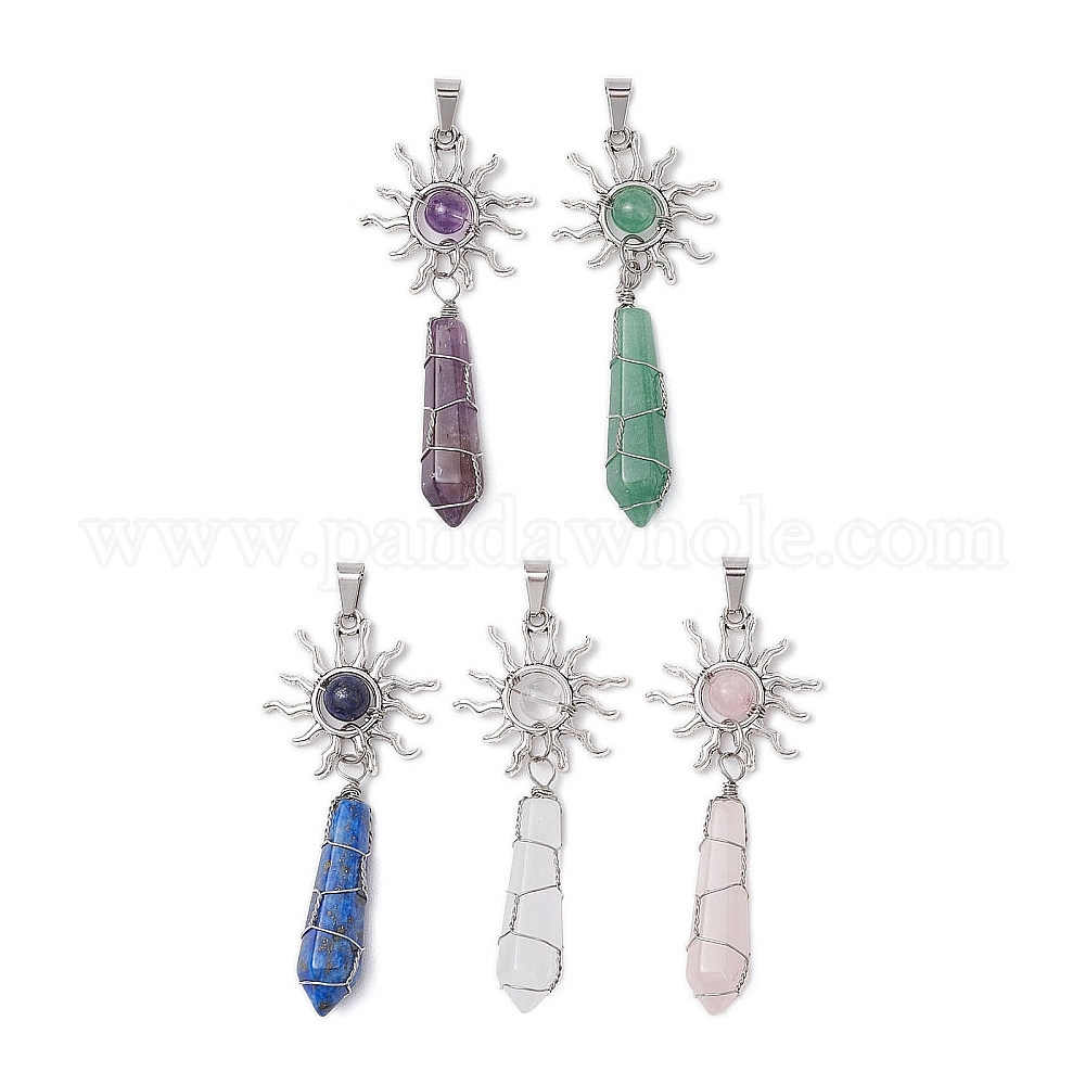 5шт. большие подвески из натурального лазурита, кварцевого кристалла, розового кварца, зеленого авантюрина и аметиста, обмотанные медной проволокой, тибетский стиль прелести сплава солнце
