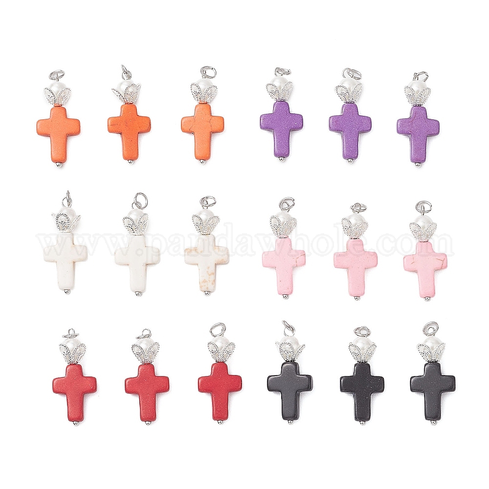 18шт. 6 подвески из синтетической бирюзы, окрашенные в цвета, крест прелести, со стеклянной жемчужиной и 304 соединительными кольцами из нержавеющей стали, цвет нержавеющей стали