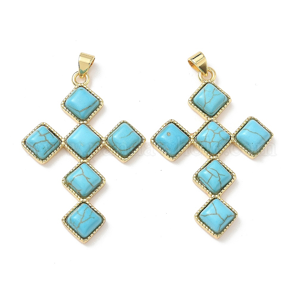 Подвески-кресты из окрашенной синтетической бирюзы в форме ромба, с латунной