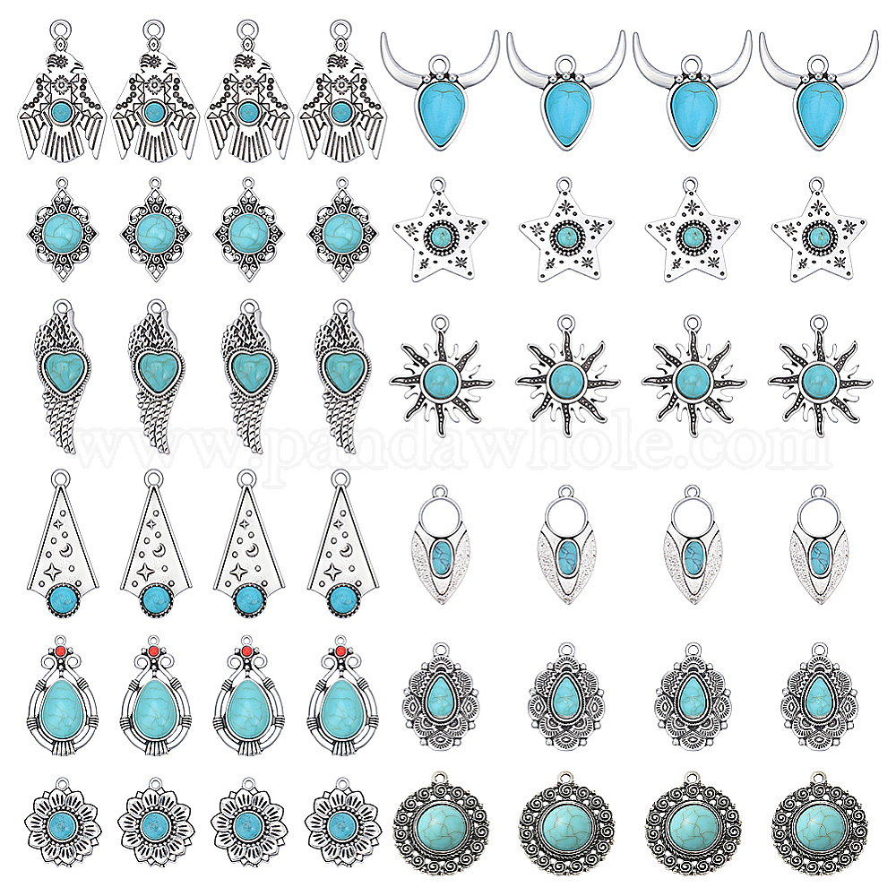48 шт. 12 стили окрашенные подвески из синтетической бирюзы, с настройки сплава, античное серебро
