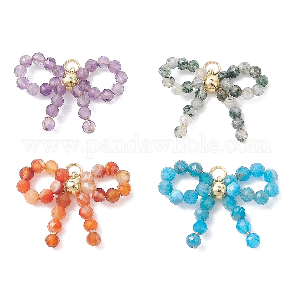 4 шт. 4 стили подвески из натурального красного агата, апатита, аметиста и мохового агата с ограненными круглыми бусинами, подвески-бантики с 304 трубчатыми дужками из нержавеющей стали, золотые