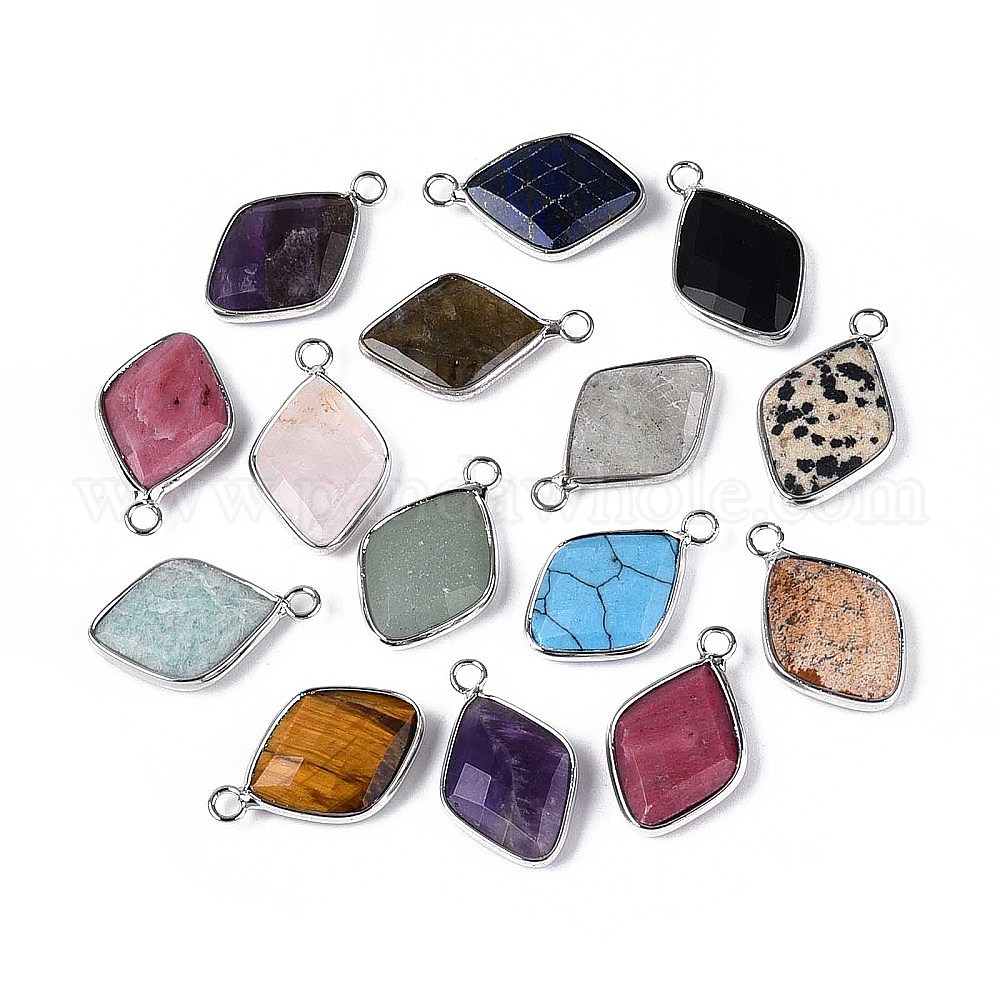 Подвески из смеси натуральных и синтетических камней в форме ромба с огранкой, с платиновой и латунной фурнитурой, смешанные окрашенные и неокрашенные