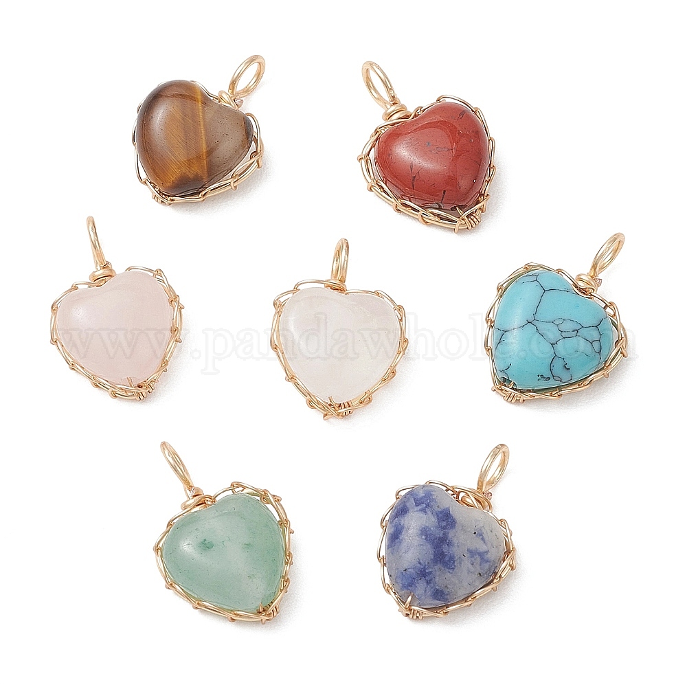 • Смешанные камни Природные и синтетические смешанные подвески драгоценных камней, подвески в форме сердца с медной проволокой, золотые, смешанные окрашенные и неокрашенные, 17.5~18.5x12~13x5.5~6.5 мм, отверстие : 3.5 мм